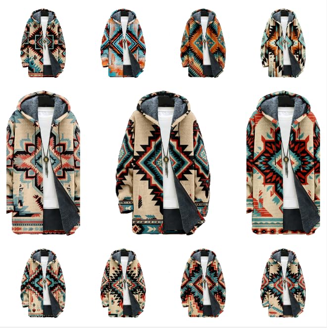 Oversized Western Aztec Long Hooded Cardigan for Men Ethnic Vintage Tribal Print Sweater Coat with Pockets