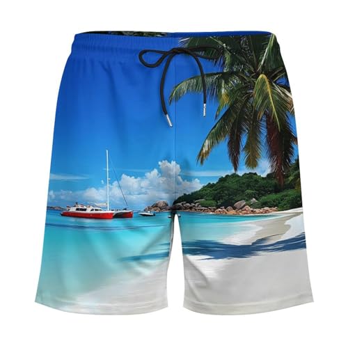 HOT ! Praslin Island Surfing Beach Scenic View Mens Swim Trunks Quick Dry Beach Board Shorts with Pockets