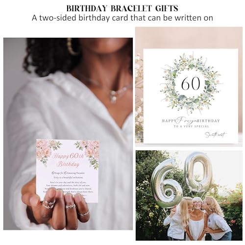 • [60th Birthday Ideas] Our women gifts for birthday bracelet are packaged in a beautifully designed gift box. Each set includes a 60th birthday card with space on the back for you to write a message and add name, adding a personal touch to your gift giving experience. Perfect for celebrating the milestone of turning sixty, it's an ideal choice as a birthday gift for women, suitable for friends, mothers, mum, aunts, grandma, nana, sisters, girlfriend, or as a special treat for yourself.