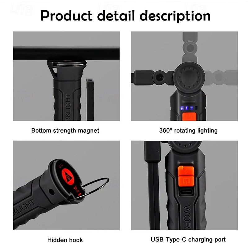 Rechargeable Work Lights LED Folding Flashlight with Magnetic Base COB Light 360Rotate Car Repair Home Garage Emergency Camping 11