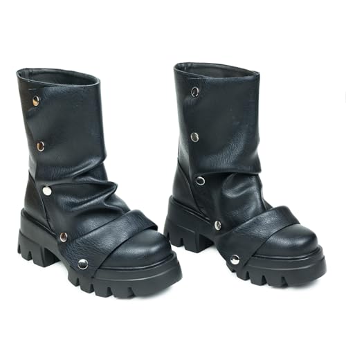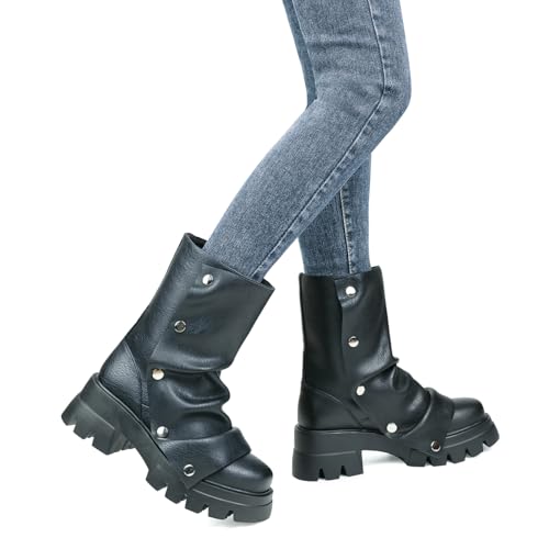 • Black women's boots are covered with artificial PU to bring high-quality appearance, The detachable snap silver button is loosely folded on the boots, easy to put on and take off.