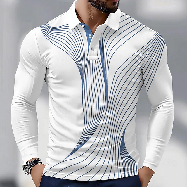 Men's Geometric Line Polo Long Sleeve Polo Shirts Collared Shirts Business Casual Athleisure Daily Wear 3D Print Spring Fall Blue Purple Green 16