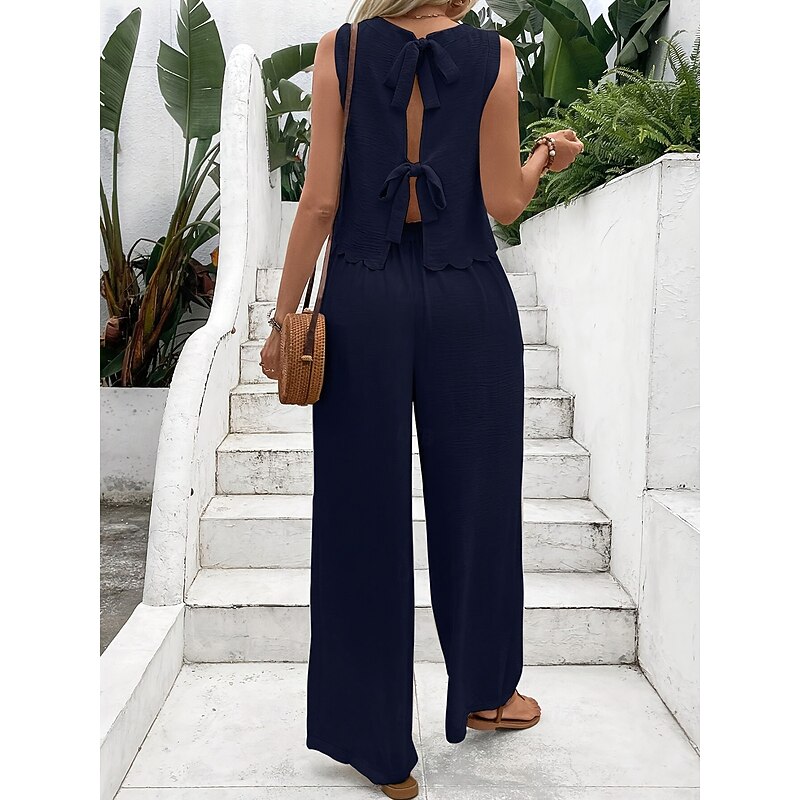 HOT ! Women's Fashion Pants Sets Sleeveless Round Neck Solid Color Lace up Backless Bow Casual Daily Black Dark Navy Orange Summer Regular Fit