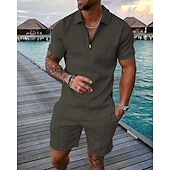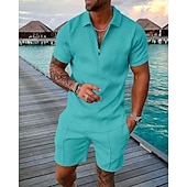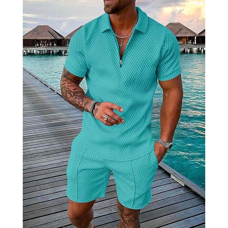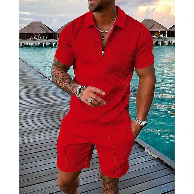 HOT ! Men's Polo Shirts Set Going out golf shirts Quarter Zip Short Sleeve Streetwear Sportswear Waves Textured Zipper Spring & Summer Slim Black Yellow Pink Red Navy Blue Blue Polo Shirts