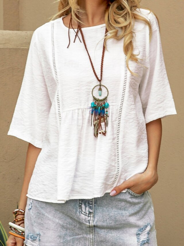 More information about Women's Shirt Blouse Cotton Linen Shirts Solid Color Basic Casual 3/4 Length Sleeve Crew Neck Regular Tops Daily White Summer Spring