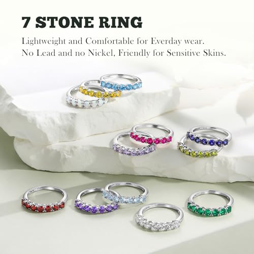 More information about 7 Stone 2mm Stackable Rings S925 Sterling Silver Created Birthstone & Cubic Zirconia Ring for Women Half Eternity Band Wedding Anniversary Ring Size 6 to 10(with Box)