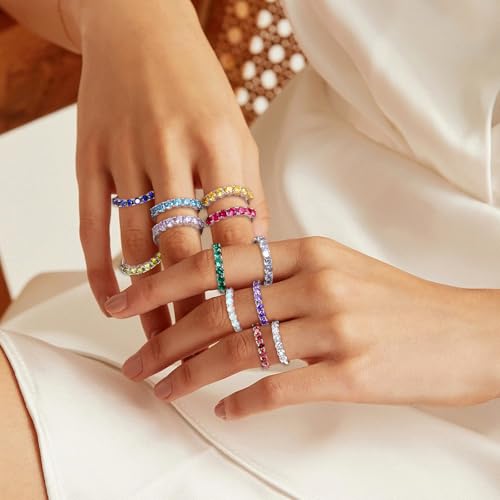 7 Stone 2mm Stackable Rings S925 Sterling Silver Created Birthstone & Cubic Zirconia Ring for Women Half Eternity Band Wedding Anniversary Ring Size 6 to 10(with Box) 4
