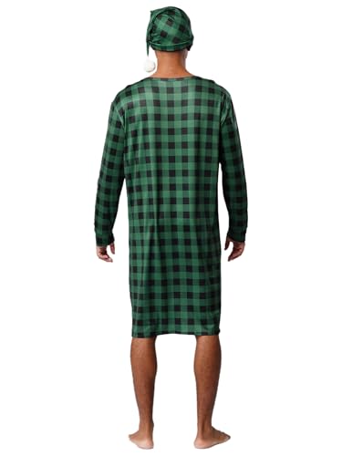 Adult Men Mid-length V-neck Nightdress Sleepwear Suit Long Sleeve Pocket Plaid Nightdress Sleep Hat 4