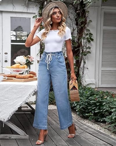 Huang's Women's Wide Leg Elastic Drawstring Denim Pants, Casual Loose Fit Flared Jeans, Straight and Stretchy Trousers