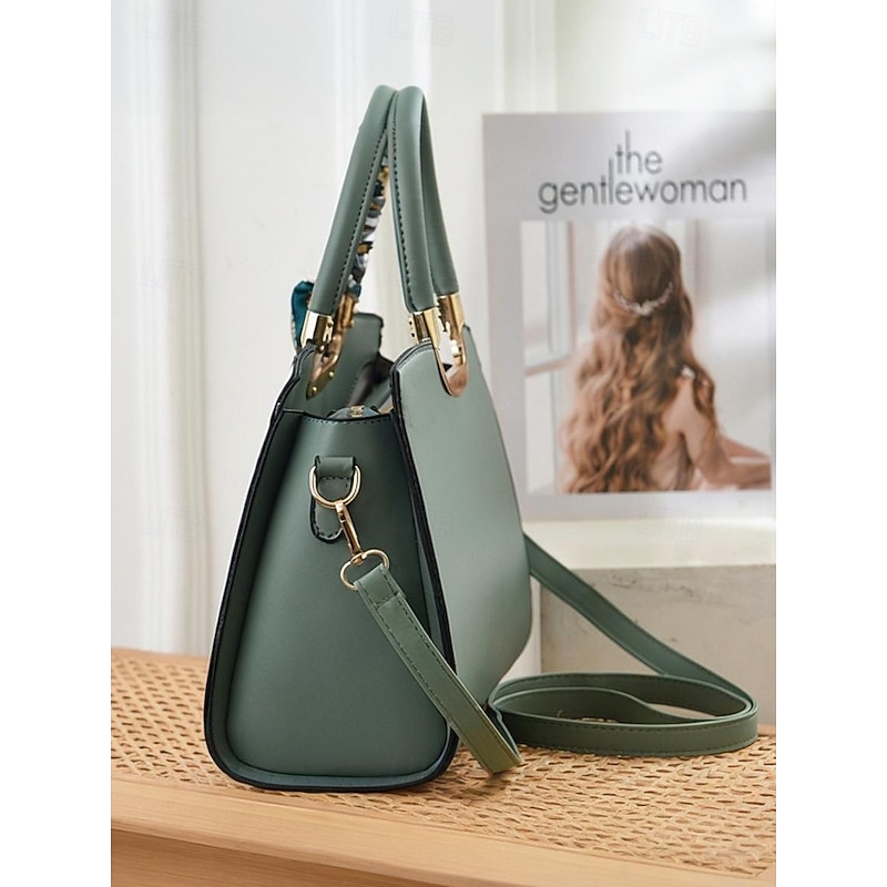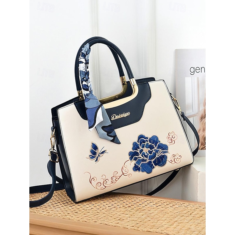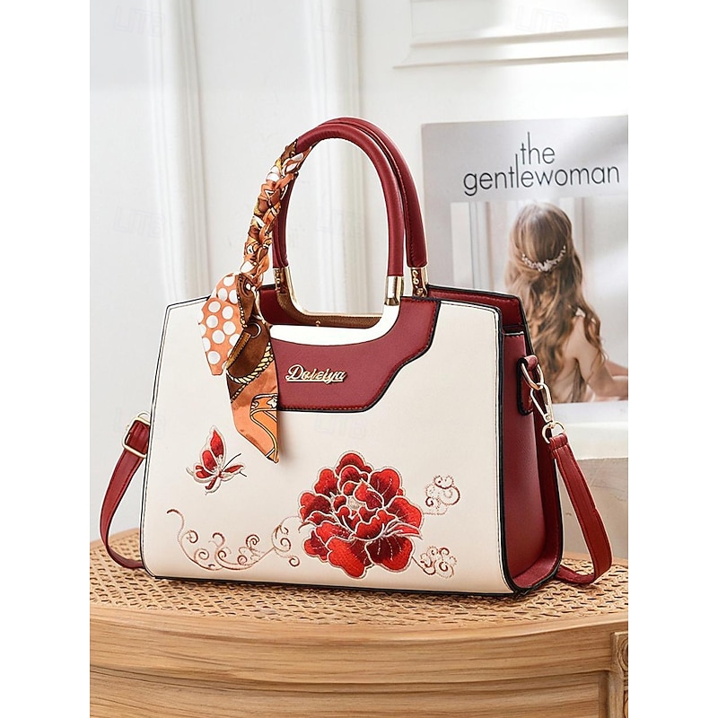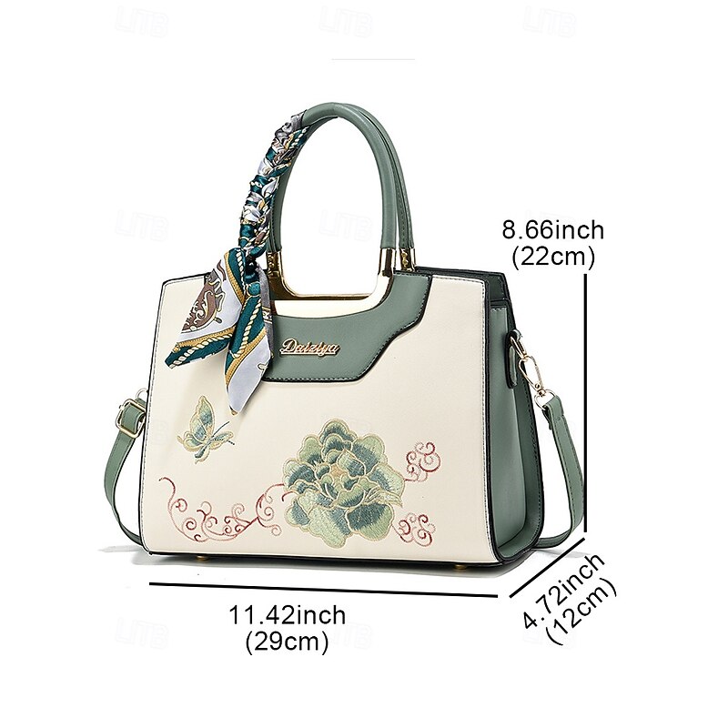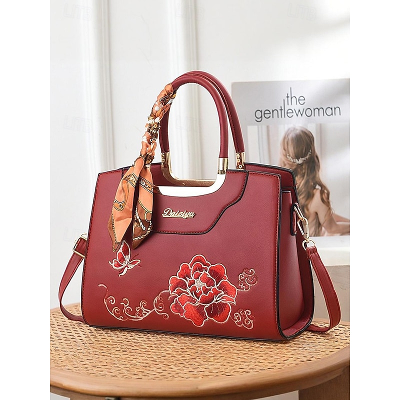 HOT ! Women's Embroidered Faux Leather Handbag with Scarf Accent – Elegant Floral Top Handle and Shoulder Bag for Office, Weddings and Daily Outings