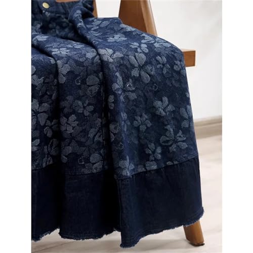 sought-after ! Deep Blue Vintage Long Maxi Women Elastic High Waist Autumn Tassels Printed Denim Skirt with Pockets