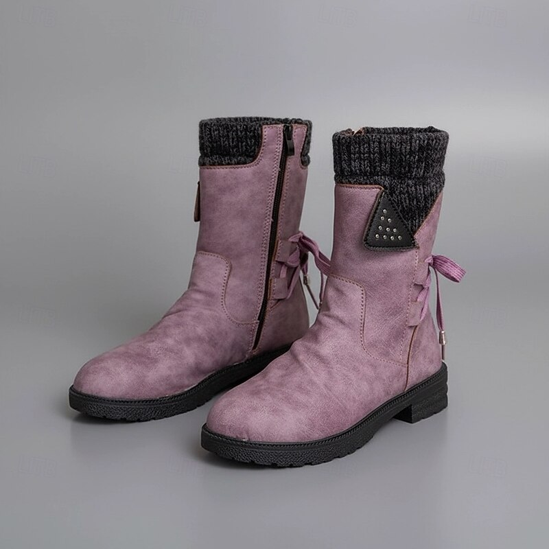 HOT ! Women's Gray Suede Mid-Calf Boots with Knit Cuffs and Lace-Up Detail - Stylish Winter Boots with Side Zipper and Rugged Sole