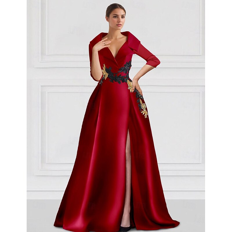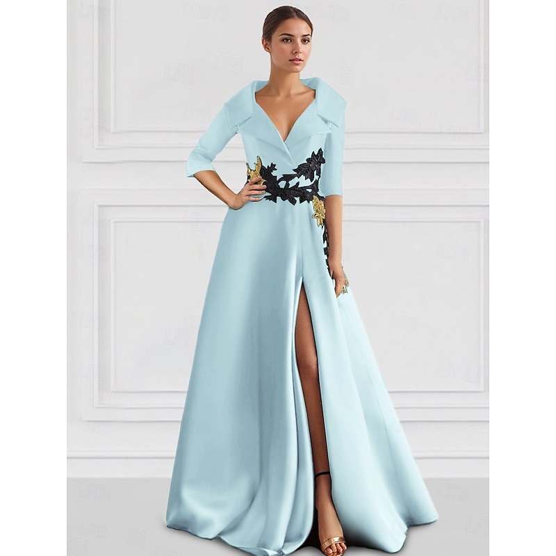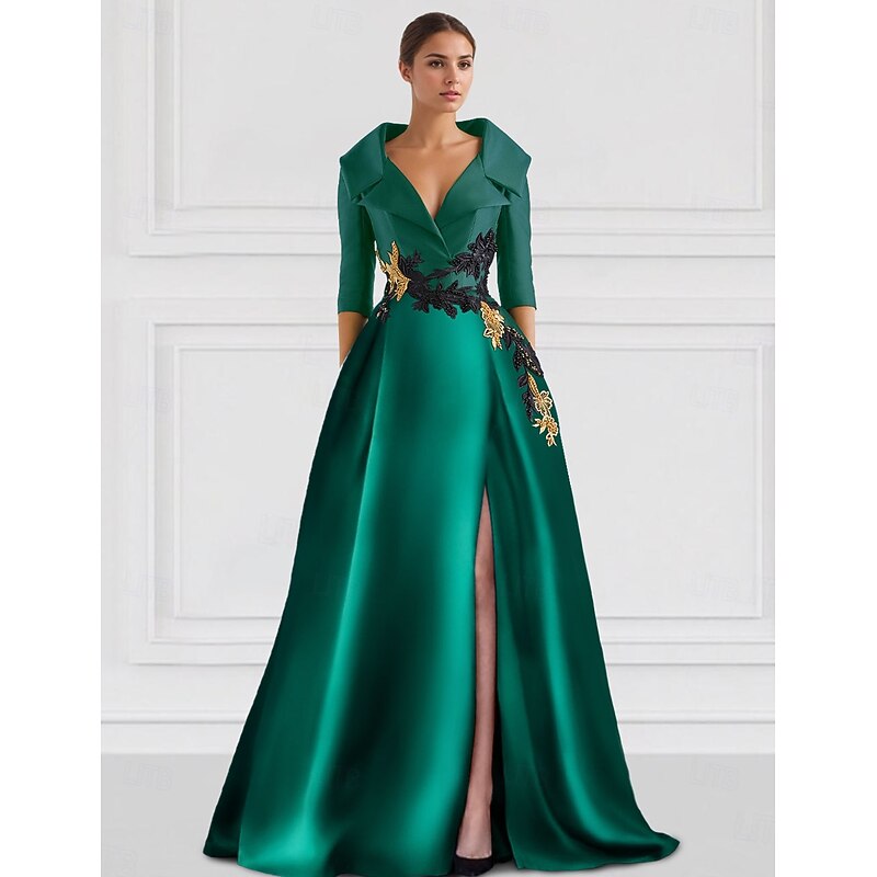 More information about Black A-Line Evening Gown Elegant Dress Tuxedo Dress Formal Floor Length 3/4 Length Sleeve Shirt Collar Pocket Satin with Appliques dress to impress