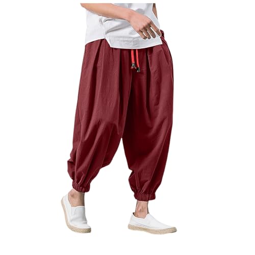 HOT ! Mens Hip Hop Harem Pants Baggy Linen Boho Jogger Parachute Pants Oversized Tapered Casual Vintage Elastic Drawstring Trouser
