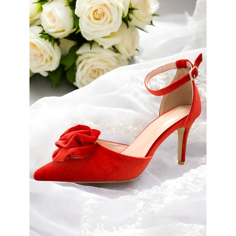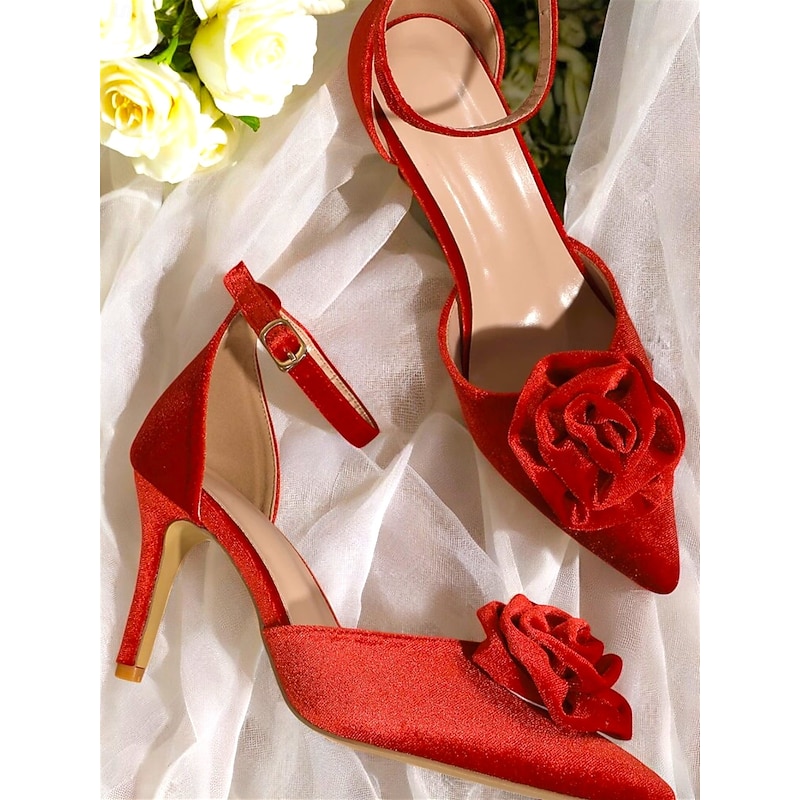 sought-after ! Red Satin Pointed-Toe Heels with Rose Detailing – enduring Wedding Shoes for Women, Ideal for Formal Events or Bridal Wear