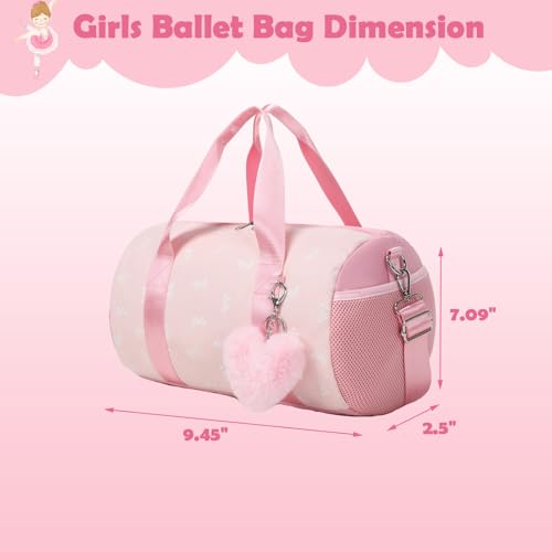 Pink Bow Ballet Bag for Girls with Plush Pendant, Shiny Girls Dance Bag Glitter Sports Duffle Bag with Shoulder Strap and Waterproof Wet Pocket for Girls 6