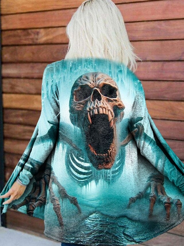 Women's Coat Lightweight Comfortable Print Open Front Vintage Artistic Casual Halloween Skull Casual Short Collarless Regular Fit Long Sleeve Outerwear Blue Purple Orange Spring Fall 11