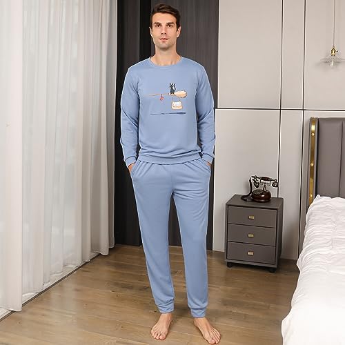 Mens Cott*n-enjoy texture long Pajamas Set cat pattern Nightwear round neck Sleepwear