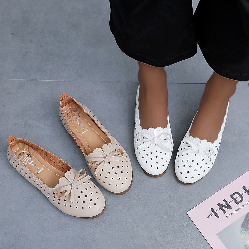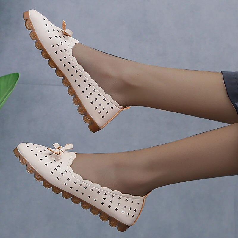 Highlights [Fabric] : Crafted from high-quality faux leather, these women's flats offer a breathable and stylish design suitable for spring, summer, and fall wear. The delicate cross-shaped perforations ensure ventilation, keeping your feet cool and comfortable. [Fit] : Featuring an elegant slip-on loafer design, these flats promise both casual and comfort wear. The flat heel and round toe ensure a comfortable fit, making them ideal for daily use. [Design Highlights] : Adorned with a charming bowknot on the front, these shoes exude femininity and elegance. The scalloped trim along the edges adds a touch of sophistication, while the sturdy rubber sole provides excellent flexibility and grip. [Occasions] : Perfect for daily activities and outdoor adventures, these flats effortlessly complement various outfits, making them an ideal choice for casual outings and elegant occasions alike. [Size Range] : Available in various sizes, from US5.5 to US8.5, these shoes are designed to suit a wide range of foot sizes. It is suggested to select one size larger than usual for the best fit.