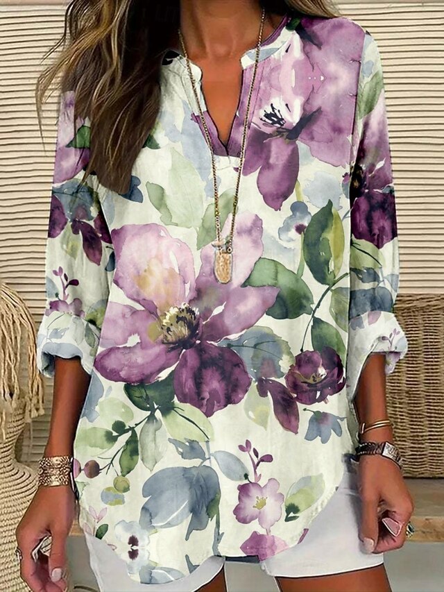 More information about Women's Blouse Floral Stylish Modern Long Sleeve V Neck Regular Tops Daily Holiday Print White Blue Lavender Purple Green Summer
