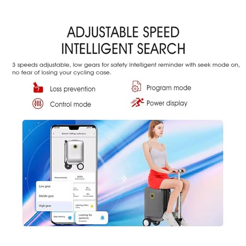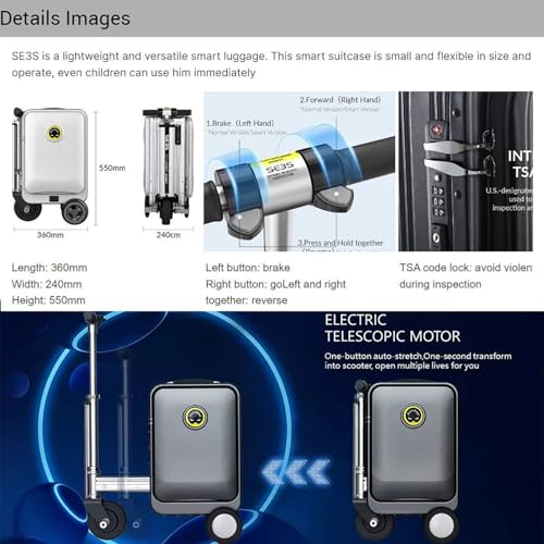 1.【Effortless Travel】Glide through airports with ease on this 20L SE3S Electric suitcase. With ample storage, and a high-capacity battery, this smart luggage is a must-have for any journey. Retractable handle, configuration gear adjustment, suitable for users of different heights.2.【Plentiful Storage】20L large-capacity storage space, with special compartments to keep your essentials organized. The side is made of imported PC coating + ABS, which is wear-resistant and not simple to deform. The combination of the two materials greatly improves the strength and pressure resistance of the box.3.【Aluminum Alloy Frame】 The TSA combination lock provides the highest security for your luggage, MAX load 110kg. The main frame of the box is made of aviation-grade aluminum alloy, and the strength and hardness are treated with special technology, light and wear-resistant,4. 【Removable Battery】73.26WH battery can meet the requirements of 8-10 kilometers manned while ensuring boarding. It is equipped with a charged interface and can be charged at any time. It can be used as a mobile power source, and convenient for travel.5. 【Features】Reversing function、LED breathing light、External charging port、One-button telescopic、APP Control、3-speed adjustment、Bluetooth disconnection alert、Remote control mode. Rigorously tested for quality, innovation, and customer satisfaction.
