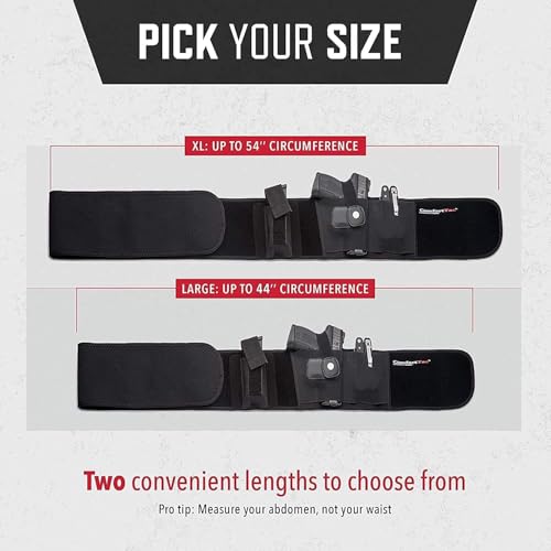 • The Large, adjustable neoprene waistband on our bellyband holster for men and women fits up to a 44" belly while the XL fits up to a 54" belly