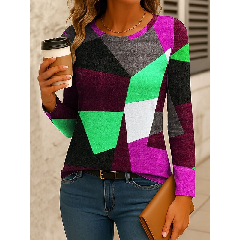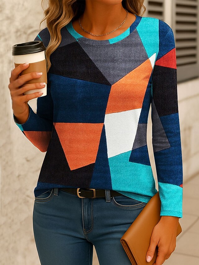 Women's T Shirt Graphic Geometric Color Block Vintage Stylish Classic Long Sleeve Crew Neck Regular Tops Daily Print Red Blue Orange Green Spring Fall Winter 7