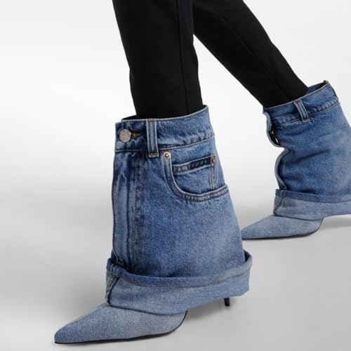 MAVMAX Women Denim Ankle Boots Pointed Toe Jeans Cowgirl Boots Metal Button Pull On High Heel Stiletto Short Cowboy Booties 5