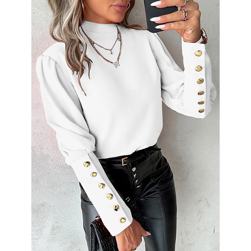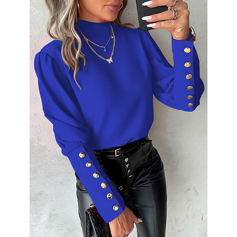 Highlights [Fabric]: Expertly crafted from high-quality polyester, this blouse offers a smooth and comfortable fit, providing durability for long-term wear. The fabric's inelastic nature ensures a structured silhouette, adding to the blouse's overall refined look. [Fit]: Designed with a slim fit, this women’s blouse gracefully drapes over your figure, accentuating your natural shape without clinging too tightly, making it a flattering choice for diverse body types. [Design Highlights]: Featuring a sophisticated high-neck design, this blouse exudes elegance with its minimalistic appeal. The standout feature is the bold, gold button detailing on the cuffs, which adds a modern flair to the classic design. The use of lace and a solid color pattern further enhances its stylish and elegant aesthetic. [Occasions]: Perfect for work and professional settings, this blouse transitions effortlessly from office hours to casual outings. Whether paired with tailored trousers for a business meeting or faux leather pants for a chic evening look, it is a versatile addition to any wardrobe. [Size Range]: Available in a variety of sizes including S, M, L, XL, and XXL, ensuring a good fit for a wide range of customers. This allows for comfortable wear and style adaptability across different body shapes and preferences.