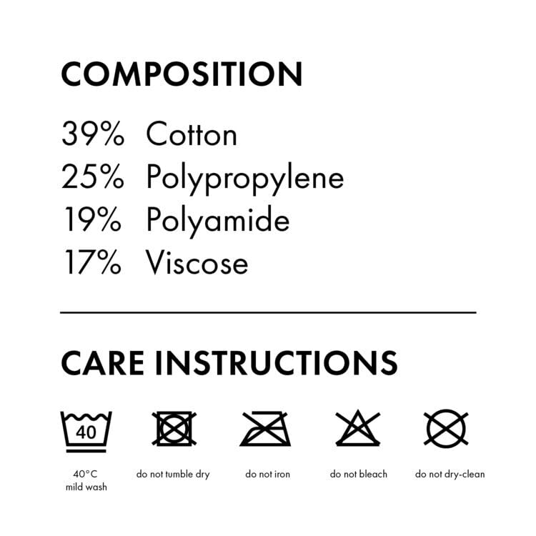 • Fabric type: 39% Cotton, 25% Polypropylene, 19% Polyamide, 17% Rayon
