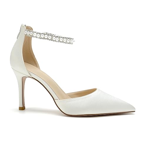 Hyinlays Women's High Heels Pearls Satin Closed Toe Stiletto Ankle Strap Pointed Toe Prom Evening Wedding Party Dress Pumps Shoes 5