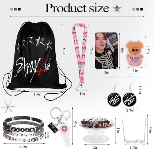 • SKZ Merch Set:The set features a handy drawstring bag for carrying your essentials on-the-go, 8 adorable cartoon badges to show off your SKZ pride, 50 vibrant stickers to personalize your belongings, 8 eye-catching photocards, 3 Design Bracelet, Necklace, Earrings, Keychain, SKZ Lanyards to add to your collection