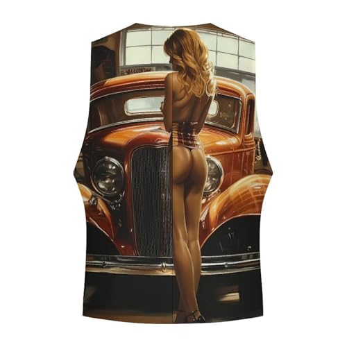 Pinup Women Sexy Hot Rod Car Garage Man Cave Suit Vest for Men Slim Fit Tuxedo Waistcoat Button Down V Neck Business Dress Coat 1