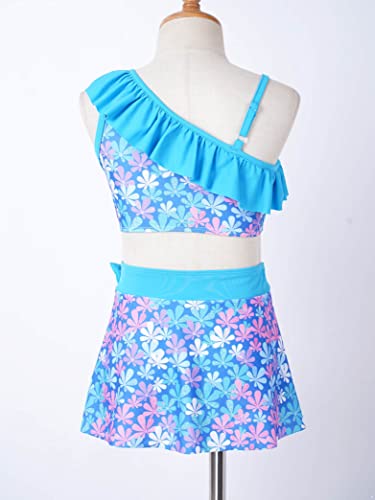 • 3Pcs Kids Girls Asymmetrical Shoulder Strap Ruffle Trim Floral Print Tops with Skirt and Briefs Set Swimming Suit