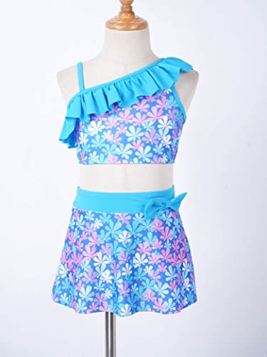 Kids Girls Tankini 3 Pieces Swimsuit Ruffles Flounce Printed Swimwear Hawaii Beach Bikini Sets Rash Guard Sky Blue 10 Years 2