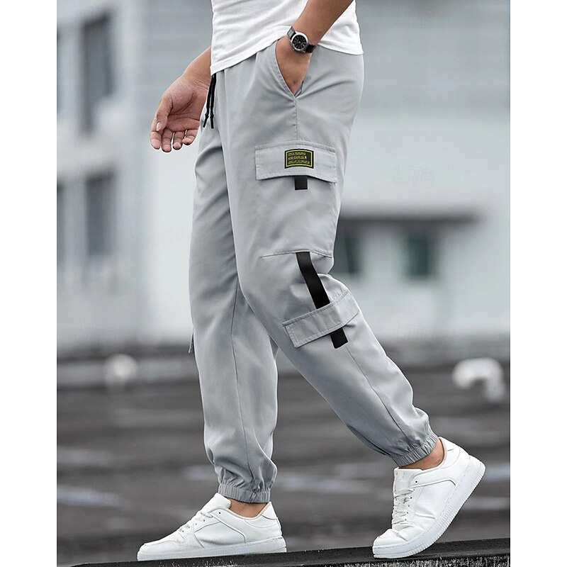 : Designed with functionality in mind, these pants boast multiple utility pockets that provide ample storage for daily essentials. The elastic waistband, complete with an adjustable drawstring, ensures a customizable fit tailored to individual comfort needs. Available in classic, neutral shades like blue, black, khaki, and light grey, these pants are a versatile addition to any wardrobe.