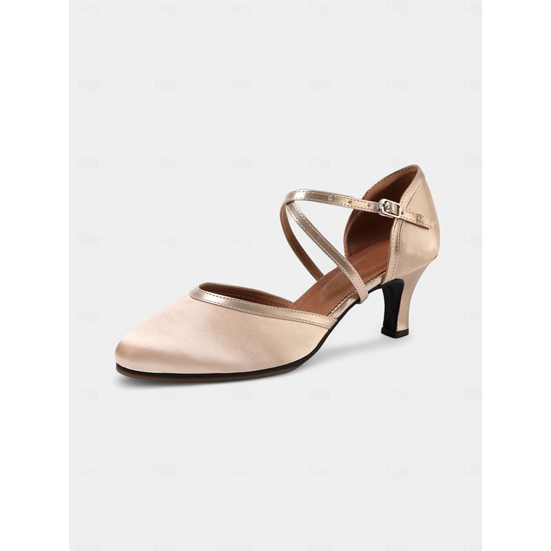 Champagne Satin Closed-Toe Dance Shoes with Cross-Strap Design for Women - Ideal for Ballroom and Social Dancing 1