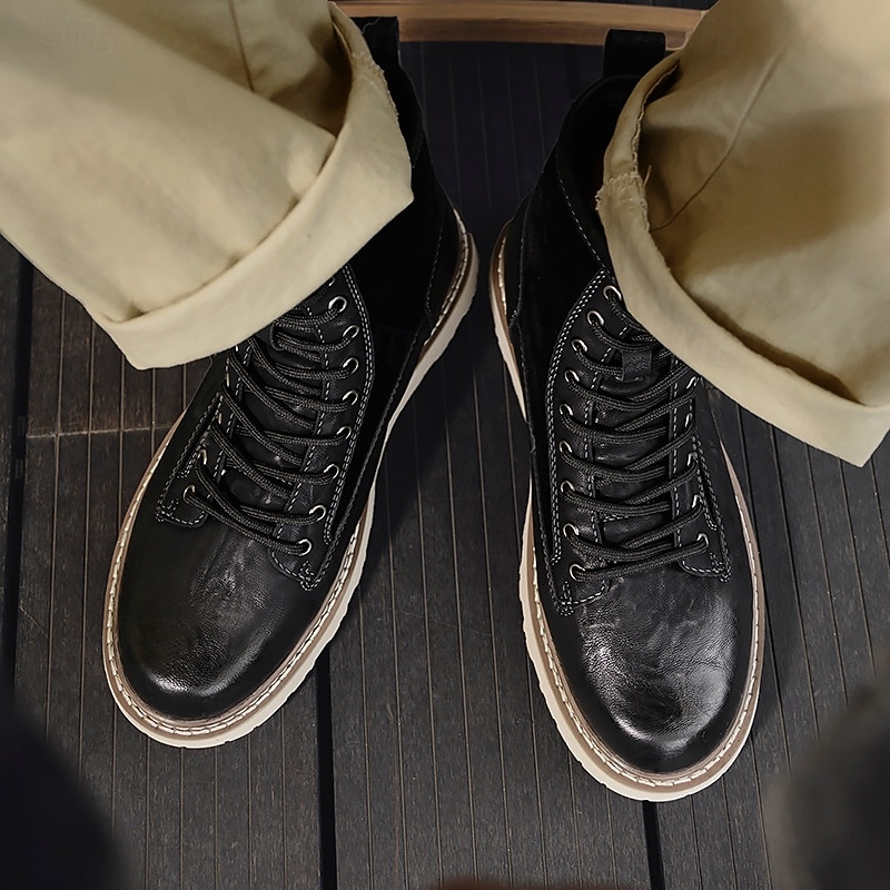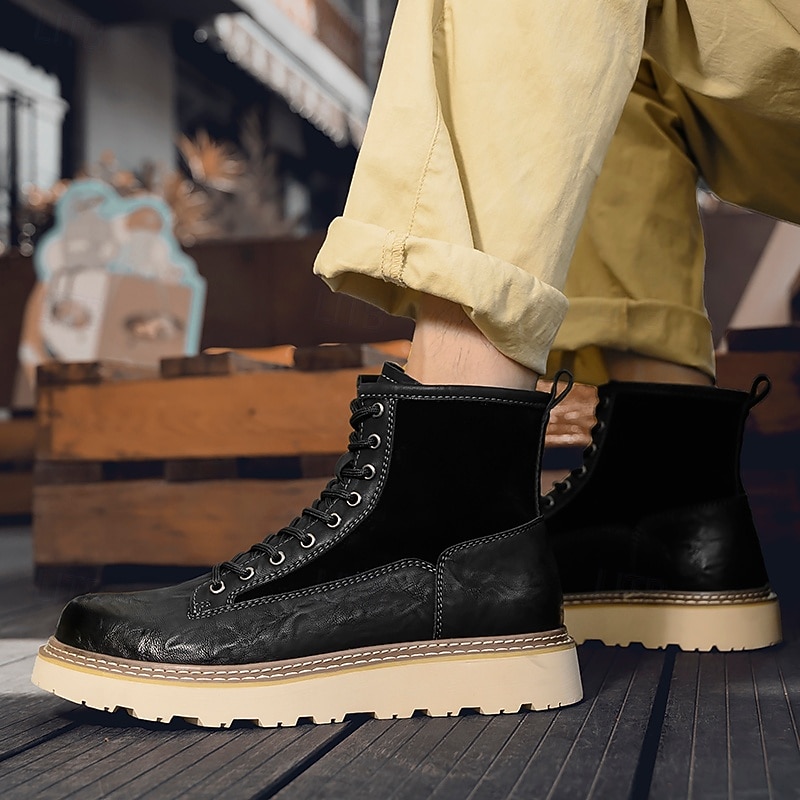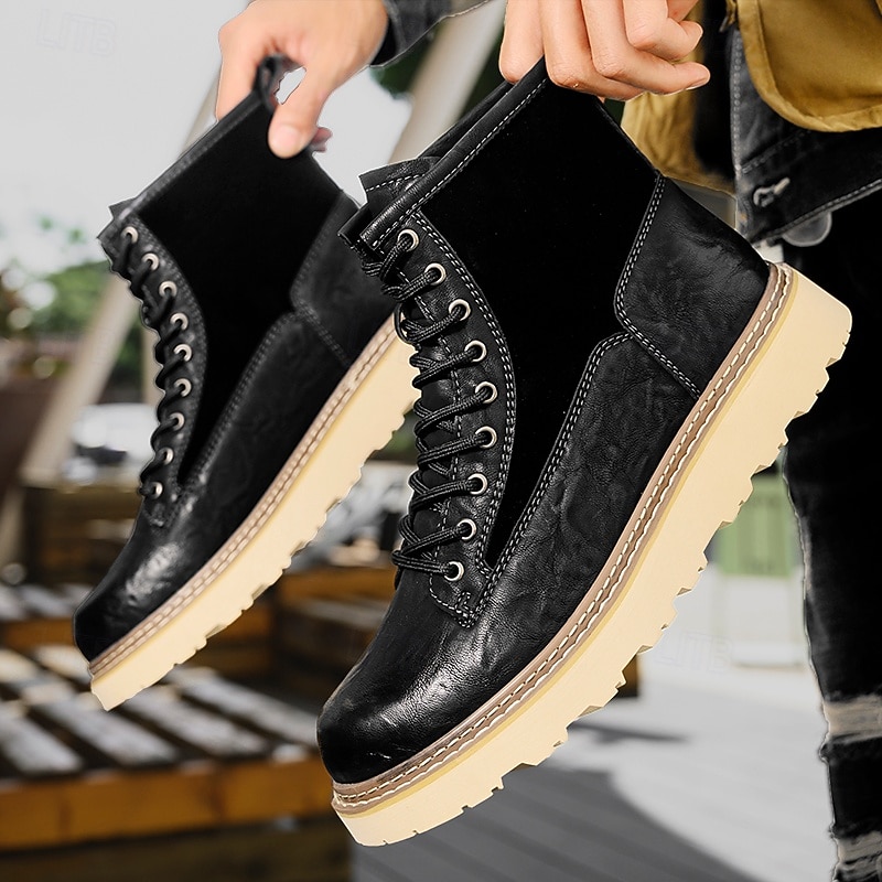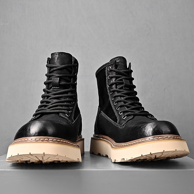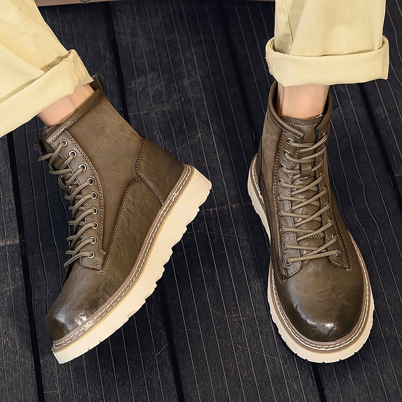 HOT ! Men's Brown Faux Leather Lace-Up Combat Boots – Durable Outdoor Work and Hiking Footwear for Daily Wear and Adventure
