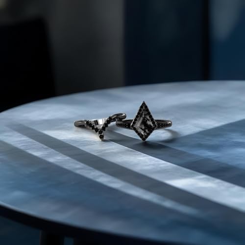 • Moss Agate Wedding Black Ring Set: Featuring a special kite-cut moss agate, this moss agate ring is framed by shimmering black pavé stones that add a bold, elegant contrast. A cascading black gemstone charm beneath the center stone symbolizes the journey of two hearts becoming one