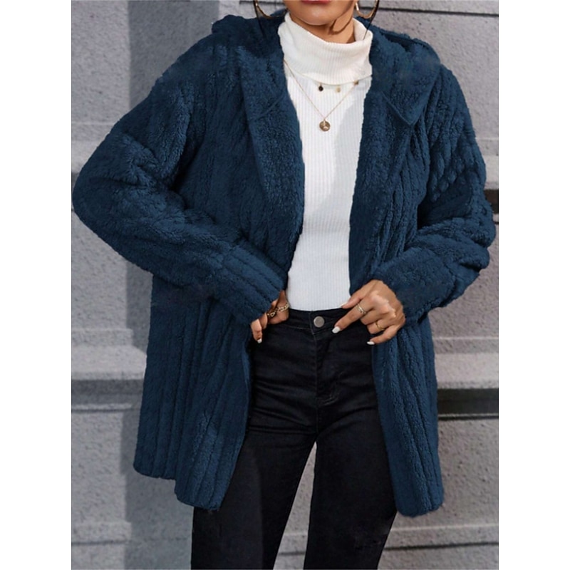 HOT ! Women's Winter Coat Sherpa Jacket Hoodie Jacket Comfortable Breathable Open Front Casual Plain Vacation Street Casual Daily Wear Open Front Regular Hooded Regular Fit Long Sleeve Outerwear Black Navy