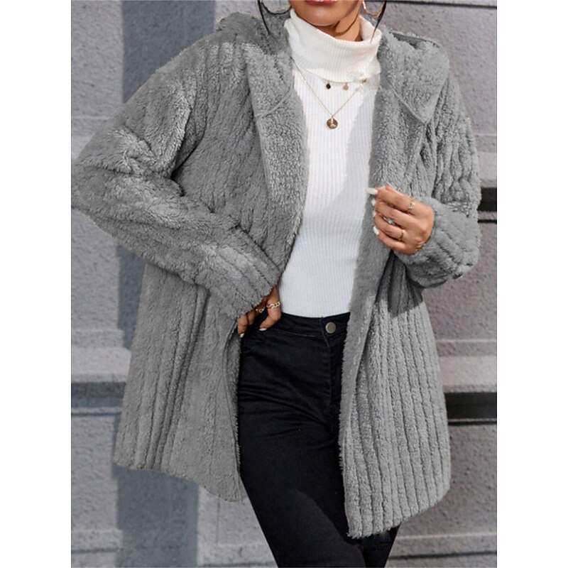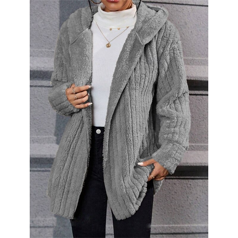 Women's Winter Coat Sherpa Jacket Hoodie Jacket Comfortable Breathable Open Front Casual Plain Vacation Street Casual Daily Wear Open Front Regular Hooded Regular Fit Long Sleeve Outerwear Black Navy 10