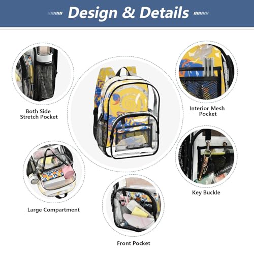 Transparent Design: Crafted with polyester and transparent PVC, Kids Clear Backpacks For School combines lightweight durability with a latest see-through style. Reinforced stitching ensures long-lasting use for daily uses.Great Organization: Features a large main compartment, front zippered pocket with interior mesh slot and key buckle, plus two side stretch mesh pockets for water bottles/umbrellas. Great for organizing school supplies, snacks, and travel essentials.sleek Prints: Colorful patterns adorn interior/exterior back panels and adjustable shoulder straps, creating a playful look kids love. Perfect for adding fun to school days or outdoor trips.Versatile for Multi-Scenarios: Optimized dimensions (10.6x7x15.7) with 13L capacity suited to school, shopping, picnics, or travel. Premium straps ensure comfort during extended wear.Occasions: Clear backpack is suitable for sporting events, music festivals, gaming events, travel and work. An Gift family, friends, and loved ones!
