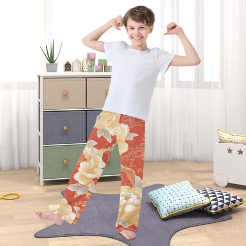 HOT ! Golden Peony Flower Boys Long Pants Soft Trousers Elastic Waist Kids Lounge Bottoms with Pockets S-XL