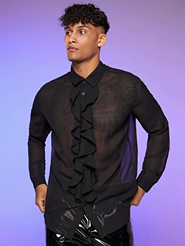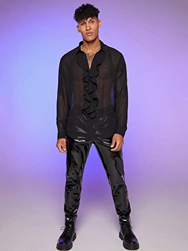 Verdusa Men's Long Sleeve Sheer Mesh Ruffle Trim Button Down Shirt Top