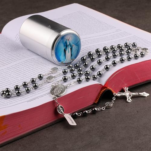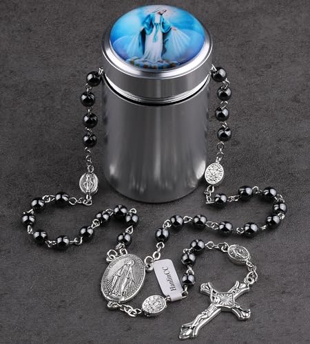 HOT ! HanlinCC 6mm Black Hematite Stone Beads Miraculous, Lourdes, Guadalupe, St.Michael, Scared Heart Jesus Catholic Rosary Necklace with Metal Gift Box for Men and Women