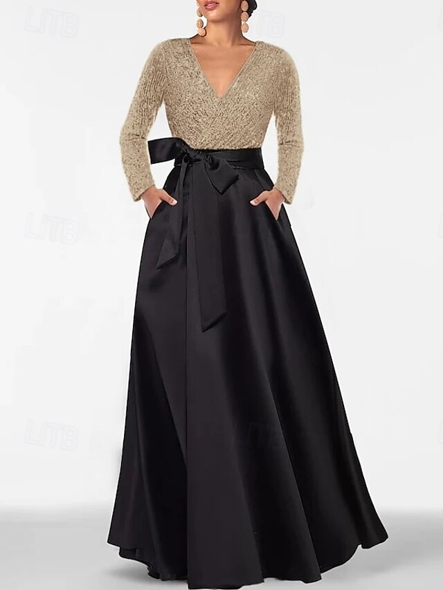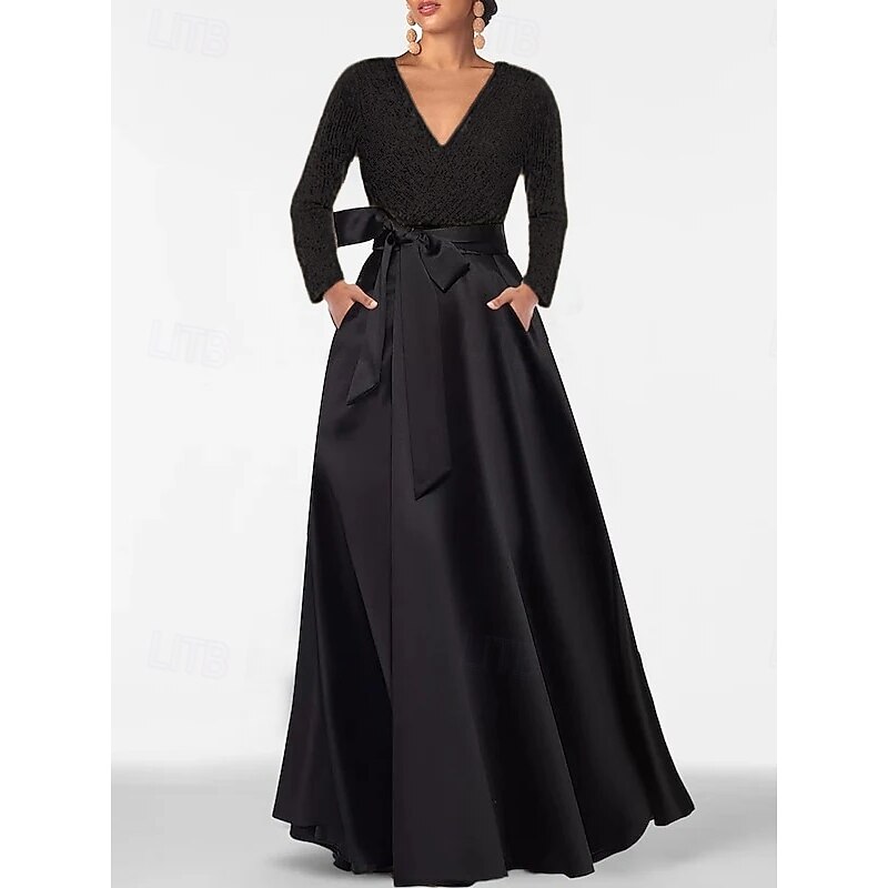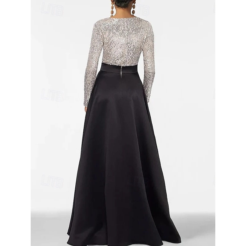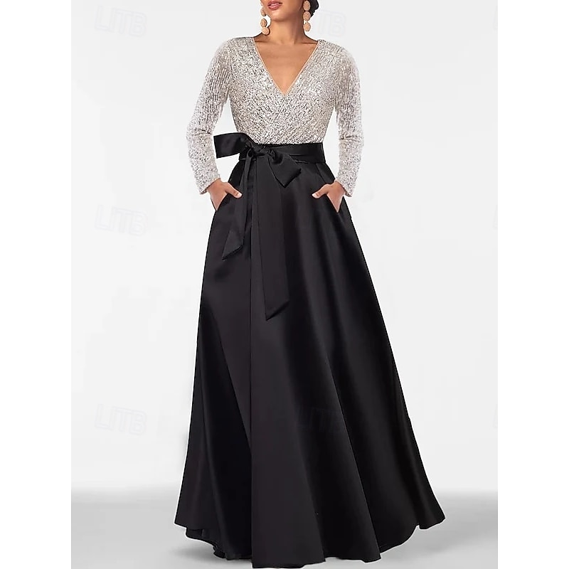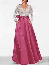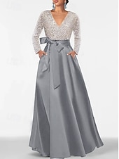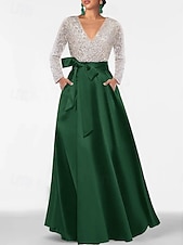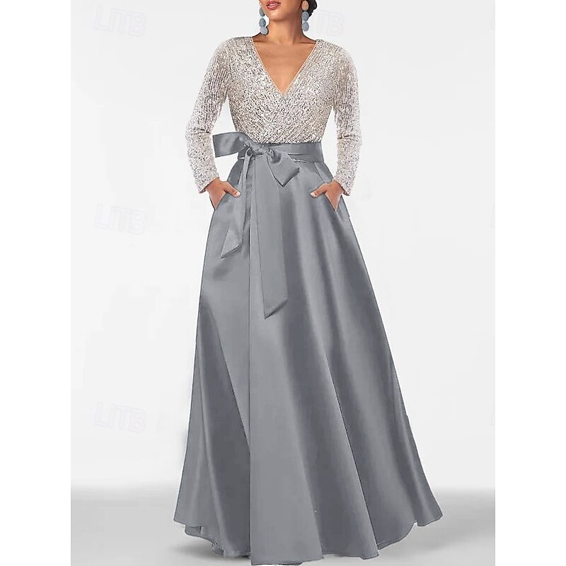 More information about A-Line Mother of the Bride Sequined Evening Gown Elegant Formal Wedding Guest Dress Floor Length Long Sleeve V Neck Pocket Satin with Glitter Slit