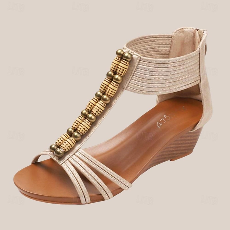 Highlights [Fabric and Material] : Crafted from microbial leather, these sandals offer a luxurious suede-like texture. The upper part is adorned with sleek, slender straps that enhance the elegance and provide a plush fit. [Silhouette and Fit] : Designed with a chic open-toe and a moderate wedge heel, these sandals provide a balanced mix of style and comfort. The wedge heel, ranging from 2 to 3 inches, elevates your look, making them perfect for both casual and formal settings. [Design Highlights] : The sandals feature a striking vertical embellishment of decorative metallic beads along the instep, imparting a touch of bohemian flair. The secure ankle strap ensures a snug fit and adds to the sophisticated design. [Occasions] : Ideal for beach trips, travel adventures, or any occasion that calls for a touch of vintage bohemian charm. These sandals seamlessly transition from casual outings to dressier events, thanks to their versatile and neutral beige color. [Size Range] : Available in a comprehensive range of sizes to cater to various needs, including US6/EU36/UK4, US7/EU37/UK5, US8/EU38/UK6, US9/EU39/UK7, US10/EU40/UK8, US11/EU41/UK9, and US12/EU42/UK10, ensuring a perfect fit for every individual. Perfect for everyday use. excellent materials and excellent craftsmanship ensure long-lasting durability.
