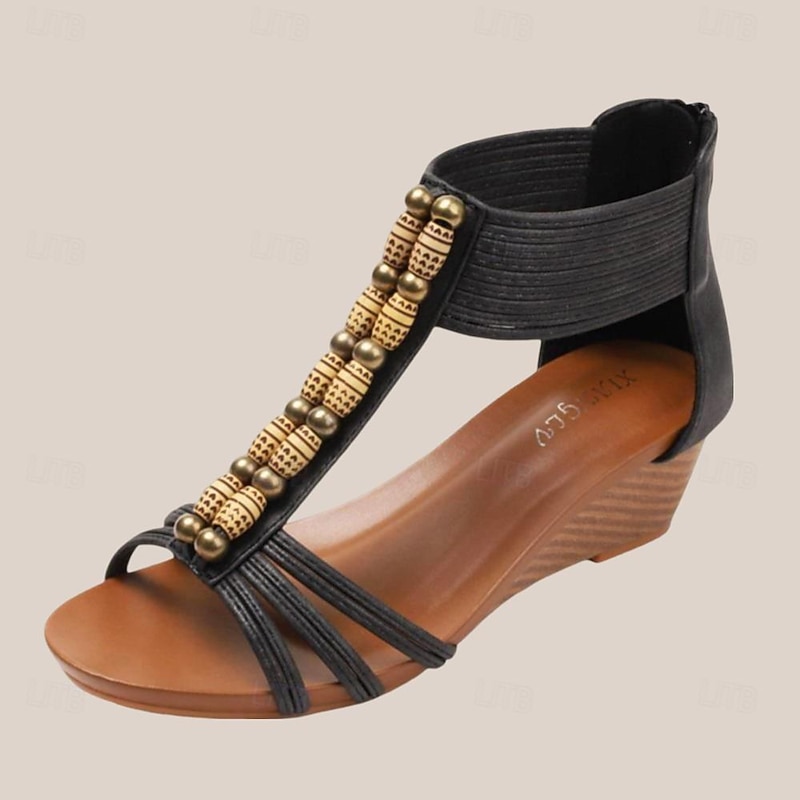Women's Boho Beaded Wedge Sandals with Elastic Strap – sophisticated Open-Toe Shoes for Summer, Beach, and Casual Outings