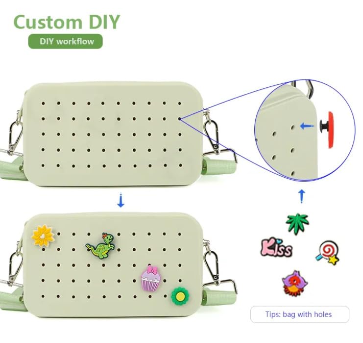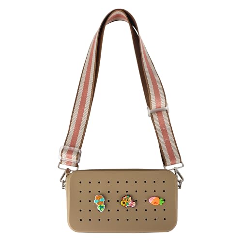 Fabric type: Cotton WebbingOrigin: ImportedClosure type: ZipperLining: Unlined Silicone InteriorADJUSTABLE COTTON STRAP : 26.77 inch (Minimum Length) to 55.11 inch (Max Length) and 2.75 inch (Width) adjustable detachable Strap,Very trendy, Easily Washed Separately.PERFECT GIFT : This bag has 3 random Charms, Looks Cute and Pretty, and has a 3 mm-sized charms hole (not for Fit Crocs Charms). Whether it is for a Birthday, Christmas, Easter, or Any Anniversary, it is a Great Gift for Women and Girls.WASHABLE & ECO-FRIENDLY : Made with 100% Food Grade Silicone, top-grade Silicone material, It has Waterproof Performance and is easy to Clean, Simply Wipe it gently with Wet Cloth to restore it to like new, Very Lightweight, only 400 GramLARGE CAPACITY : Carry your essentials like a Phone,Wallet,Keys,Cosmetics. Dimensions : 8.66(L)x2.75(W)x5.1(H)COMPLIMENT YOUR STYLE : These handbags for adult,Youth and Kids, Stylish Everyday use, Portable Travel, Beach, Camera Bag. Perfect for everyday use. High quality materials and excellent craftsmanship ensure long-lasting durability.