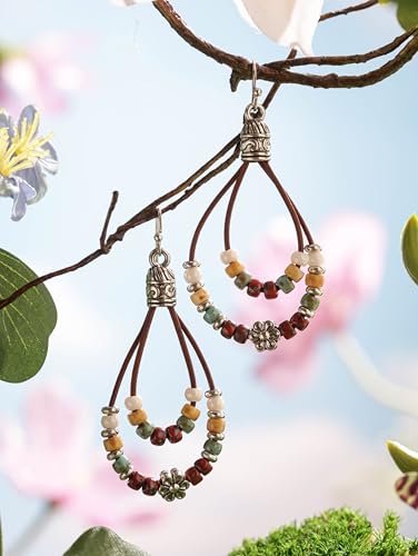 MINACHI Statement Boho Drop Earrings with Silver Floral Charm and Colorful Beads, Handmade Leather Loop Earrings for Women